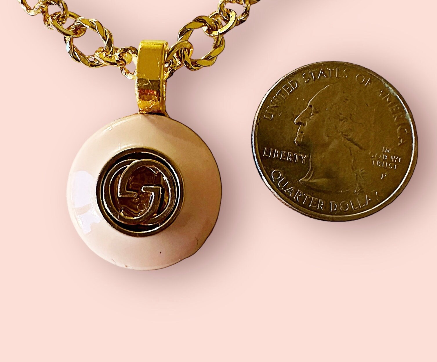 Introducing our chic necklace featuring a soft pink vintage Gucci button pendant. The adjustable chain, crafted from 24K gold plated brass, adds a touch of luxury, reaching up to 19 inches in length. Perfect for adding a hint of vintage glamour to any ensemble.