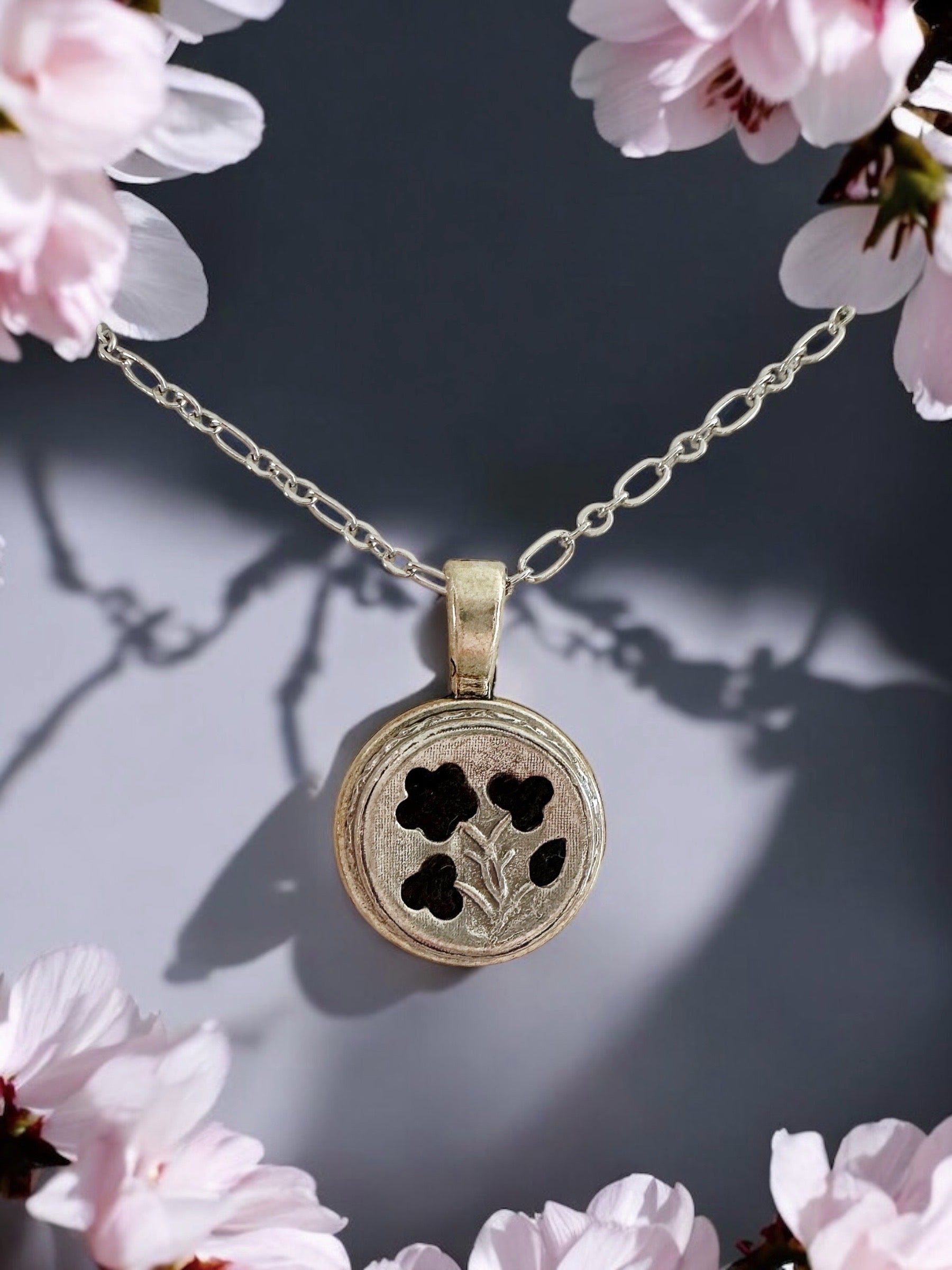 Necklace is adjustable (up to 21 inches) - white gold filled chain and components. Button is about the size of a penny.