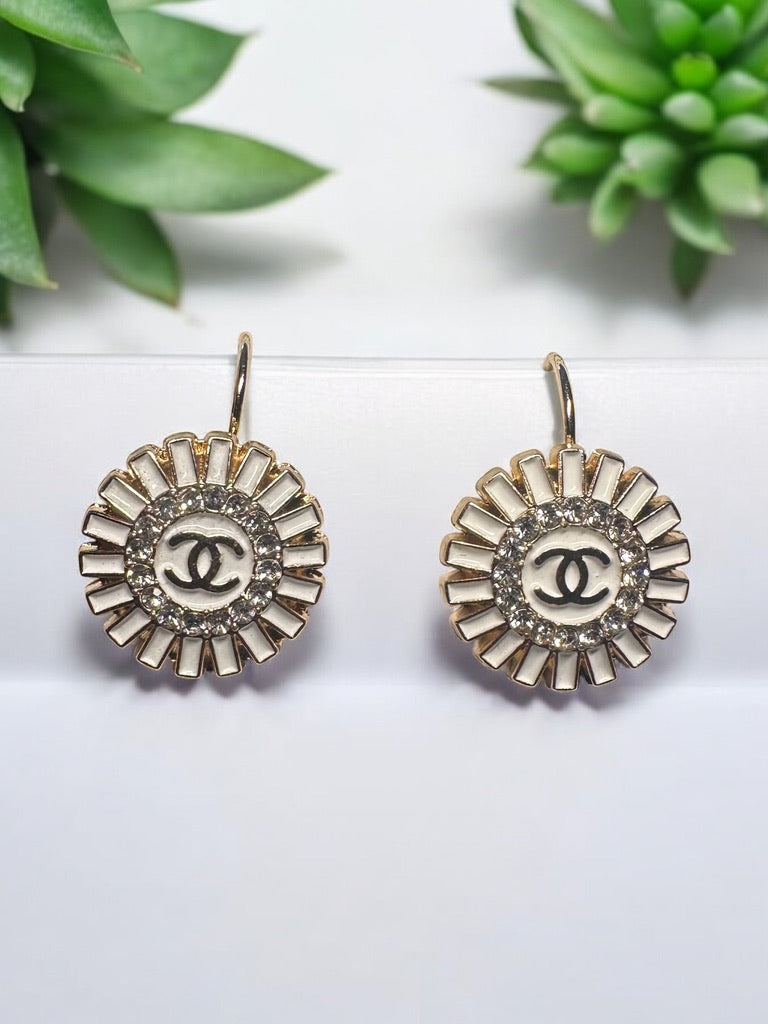 Vintage Designer Up-Cycled White and Gold Rhinestone Leverback Chanel Button Earrings